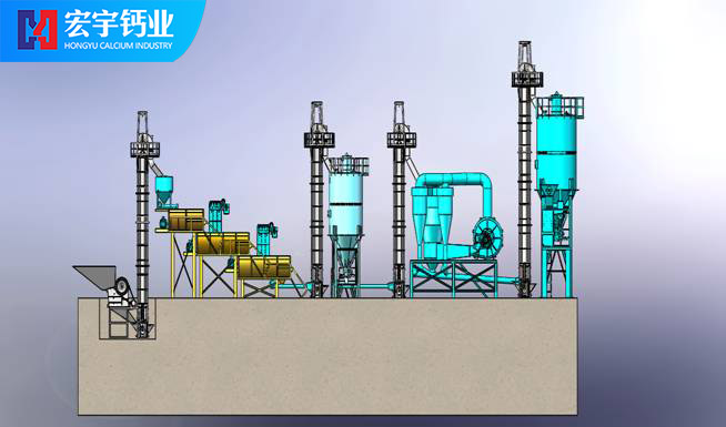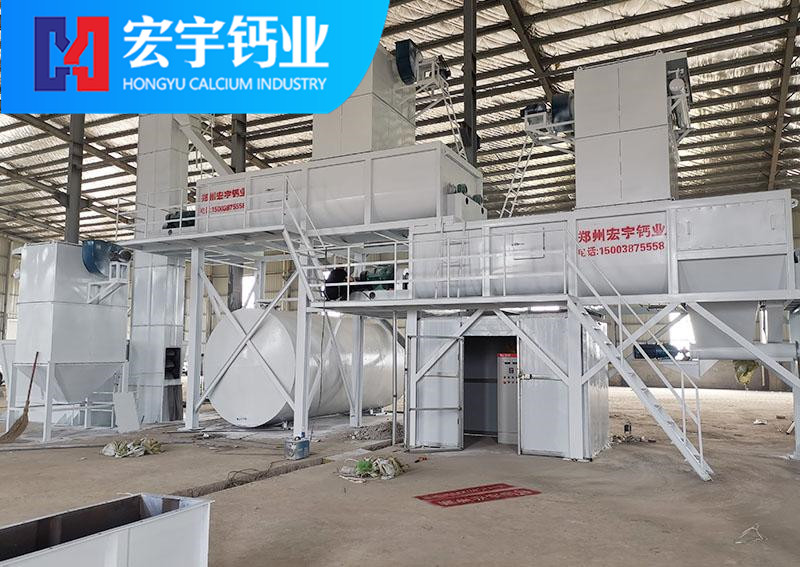 將合格的氧化鈣(CaO)塊料由鄂式破碎機破碎至40mm左右粒度,經斗式提升機送入氧化鈣儲存罐料倉,料倉中的氧化鈣經穩流輸送機定量穩重系統進入氫氧化鈣Ⅰ級消化器進行初步消化,當氫氧化鈣完成初級消化以后進入Ⅱ級消化或Ⅲ級消化器,使氧化鈣消化分解,生成合格的氫氧化鈣初級產品,消化率達到98%,(消化系統根據產能要求,機型設計分為單軸、雙軸及多軸機型)。消化分解好的氫氧化鈣再由半成品螺旋輸送機送入選粉機內,由選粉機完成產品雜質分離和細度分級,完成分級后的終端合格產品,由成品輸送機、提升機卸入成品氫氧化鈣罐倉進行分別包裝。本套生產線所有污染節點由脈沖除塵器完成,收塵率達到99.5%。